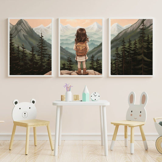 Girl Adventurer Mountain Vista Wall Art – Vintage Nursery Print • Set of 3