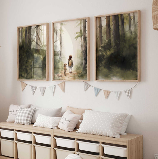 Girl and Dog Triptych Wall Art – Adventure Girls Room Decor • Set of 3