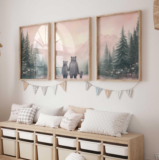 Bear Family Wall Art – Animal Nursery Print for Girls • Set of 3