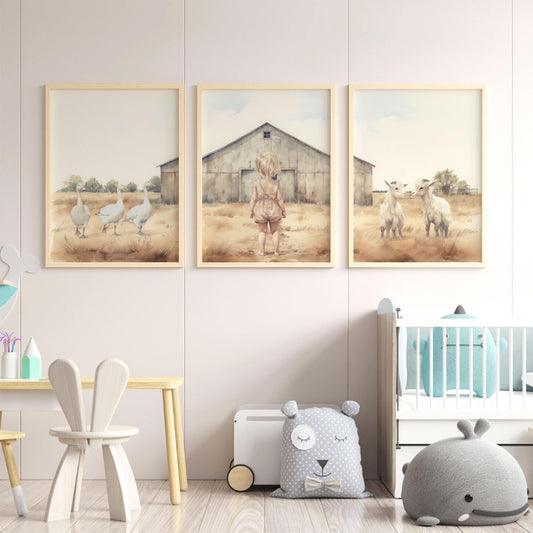 Goats and Geese Wall Art – Farm Nursery Print for Girls Room • Set of 3
