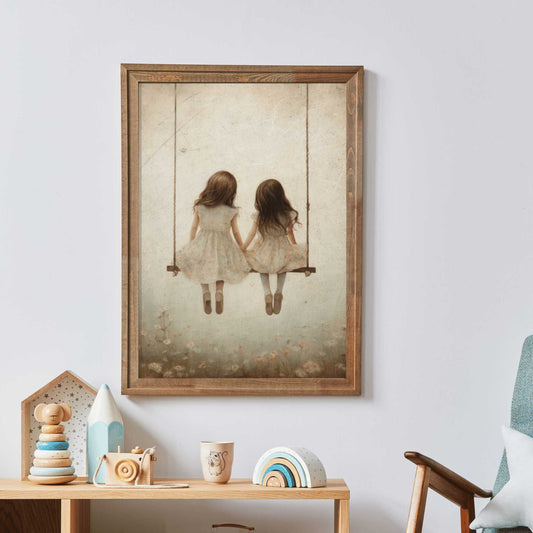 Girls on Swing Print – Vintage Nursery Wall Decor