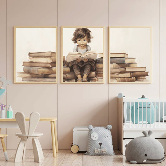 Little Girl on Books Wall Art – Vintage Nursery Print for Toddler Room • Set of 3