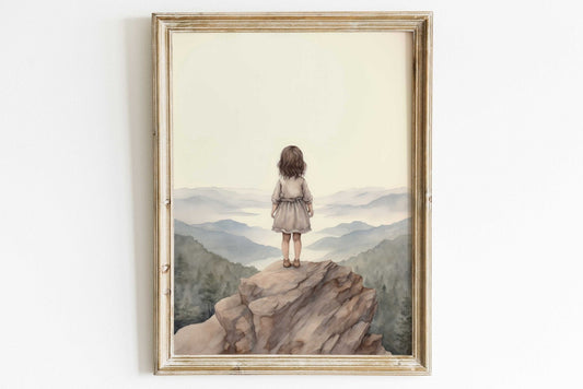 Brown-Haired Girl Mountain Print – Adventure Nursery Wall Art