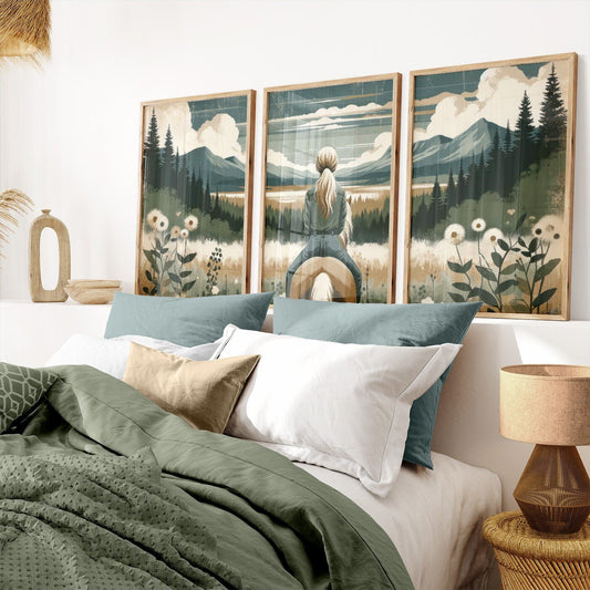 Young Girl on Horseback Wall Art – Equestrian Nursery Print • Set of 3