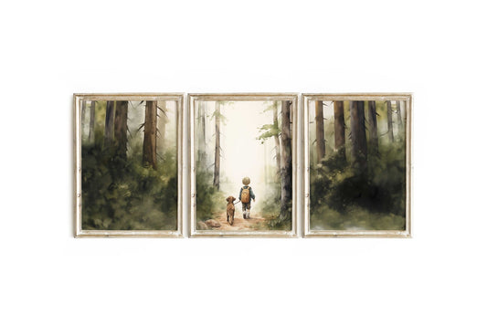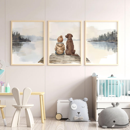 Boy and Dog Wall Art – Animal Nursery Print • Set of 3