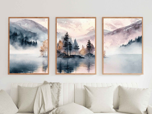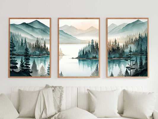 Lake & Mountain Wall Art – Landscape Living Room Print • Set of 3