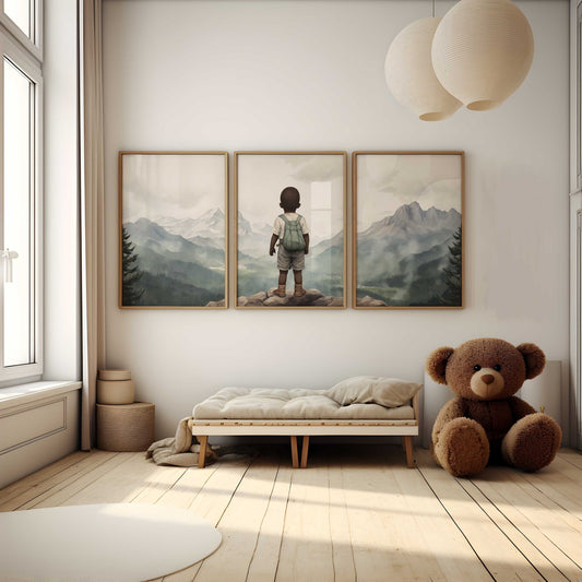 Black Boy Adventure Wall Art – Mountain Kids Room Print • Set of 3