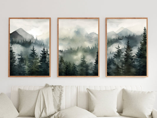 Watercolor Forest Wall Decor – Landscape Living Room Print • Set of 3
