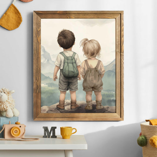 Brother & Sister Wall Art, Sibling Adventure Decor, Mountain Nursery Print