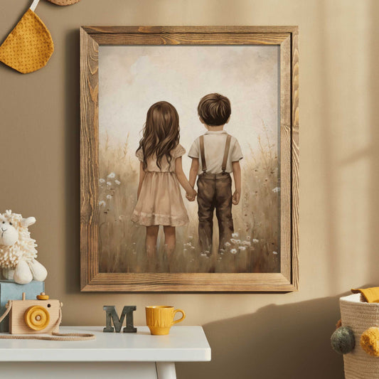 For babies and toddlers, gentle images of siblings playing or holding hands create a calming backdrop. As children grow, more dynamic prints—such as brothers and sisters exploring outdoors—continue to feel relevant. Choosing flexible sibling artwork now means it can stay on the walls for years without needing to be replaced.