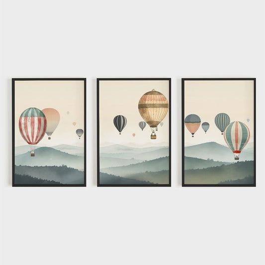 Hot Air Balloon Wall Art – Landscape Living Room Decor • Set of 3