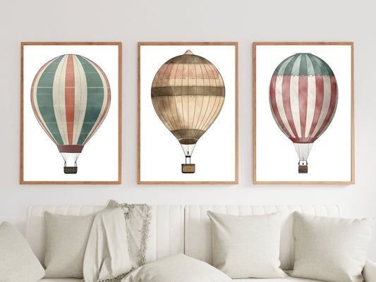Vintage Hot Air Balloon Wall Decor – Travel Living Room Print • Set of 3