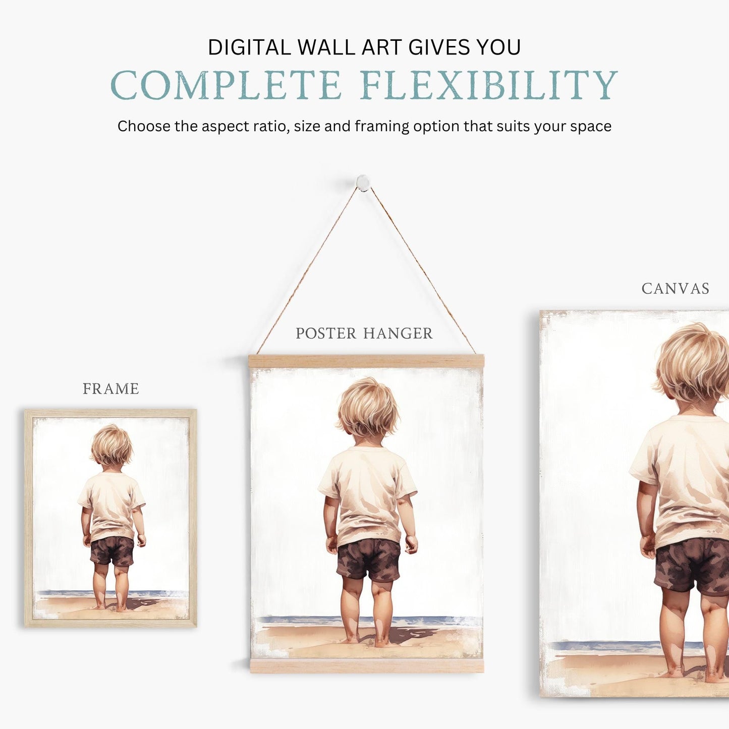 Introducing the “Blonde Toddler Beach Print,” a captivating piece that encapsulates the essence of childhood wonder. This enchanting artwork features a nostalgic image of a blonde toddler boy mesmerized by the ocean, perfectly symbolizing innocence and joy. Ideal for creating a warm, inviting atmosphere in any child's space.