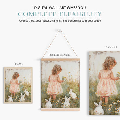 Transform your child's nursery with our enchanting Little Girl and Bunnies Print, featuring a vintage-inspired scene of a little girl surrounded by playful white bunnies in a wildflower field. The charming motif captures innocence and wonder, making it a delightful addition to any nursery decor.