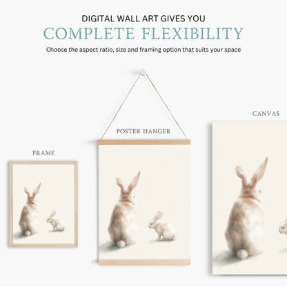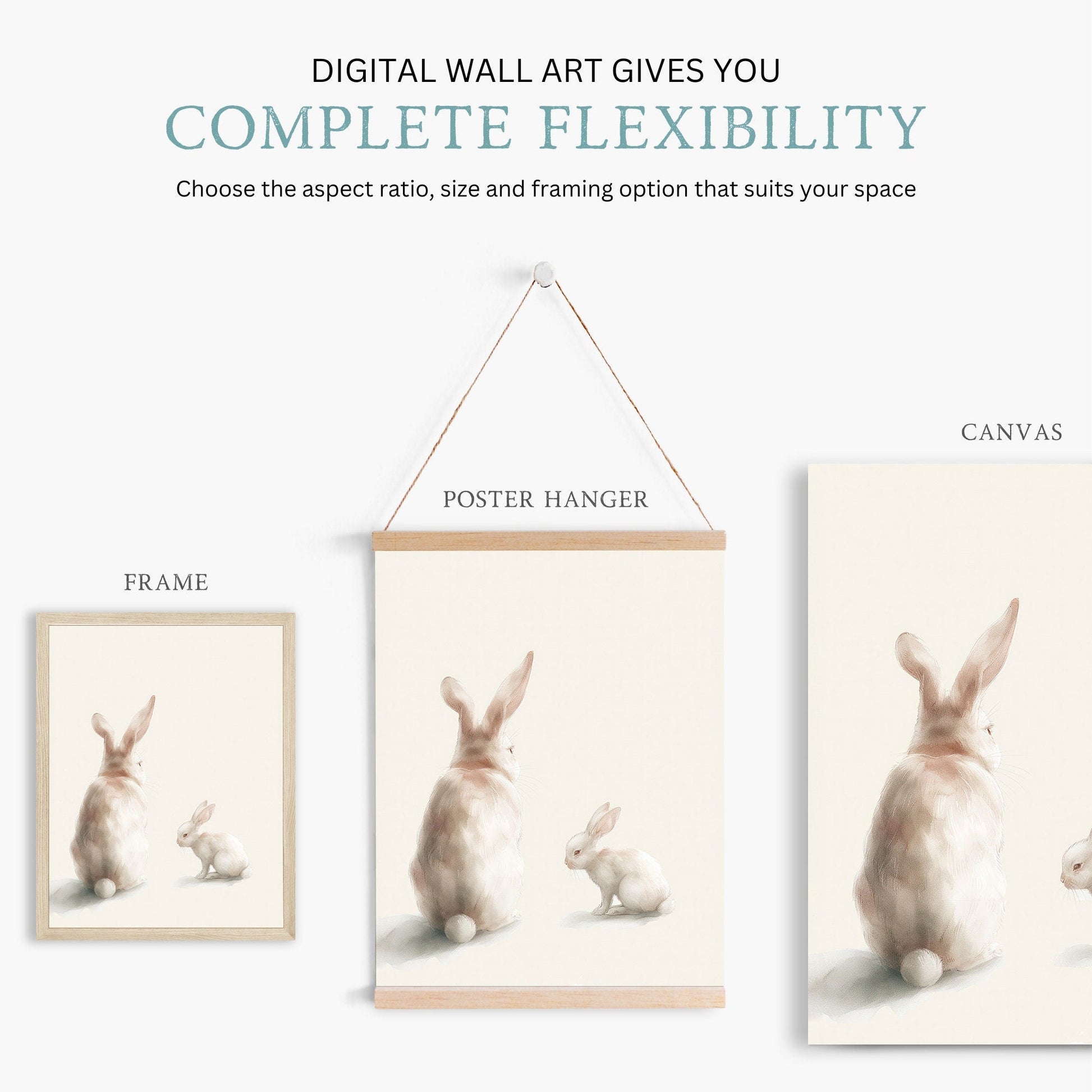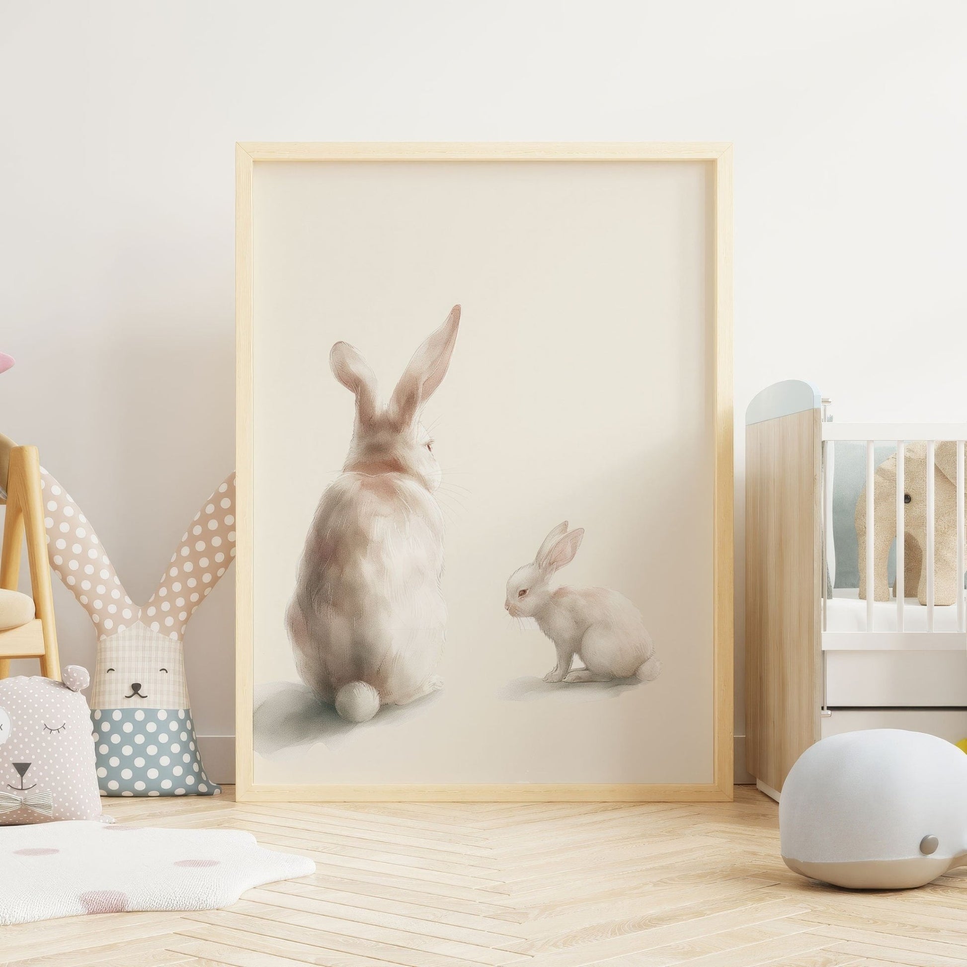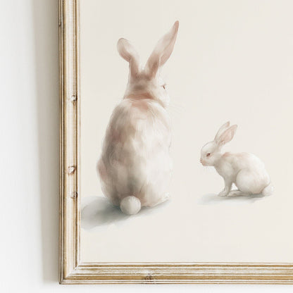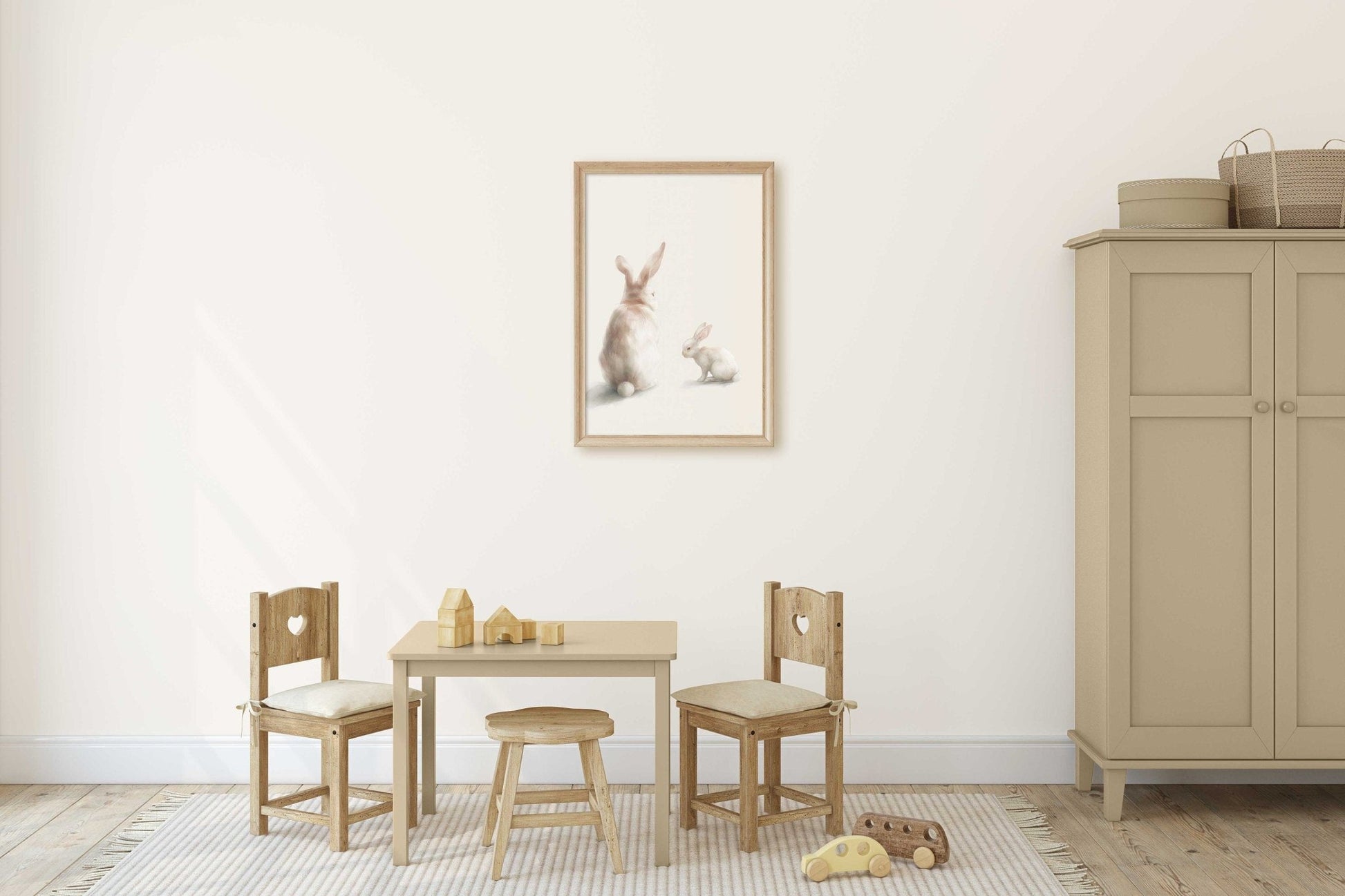 Add a sprinkle of joy to your little one's space with our enchanting Rabbit and Bunny Minimalist Wall Art. This delightful print features a big rabbit and a small white bunny, depicted from behind against a crisp white backdrop. The vintage painting style and minimal design bring warmth and a whimsical touch, making it an ideal centerpiece for any nursery decor.