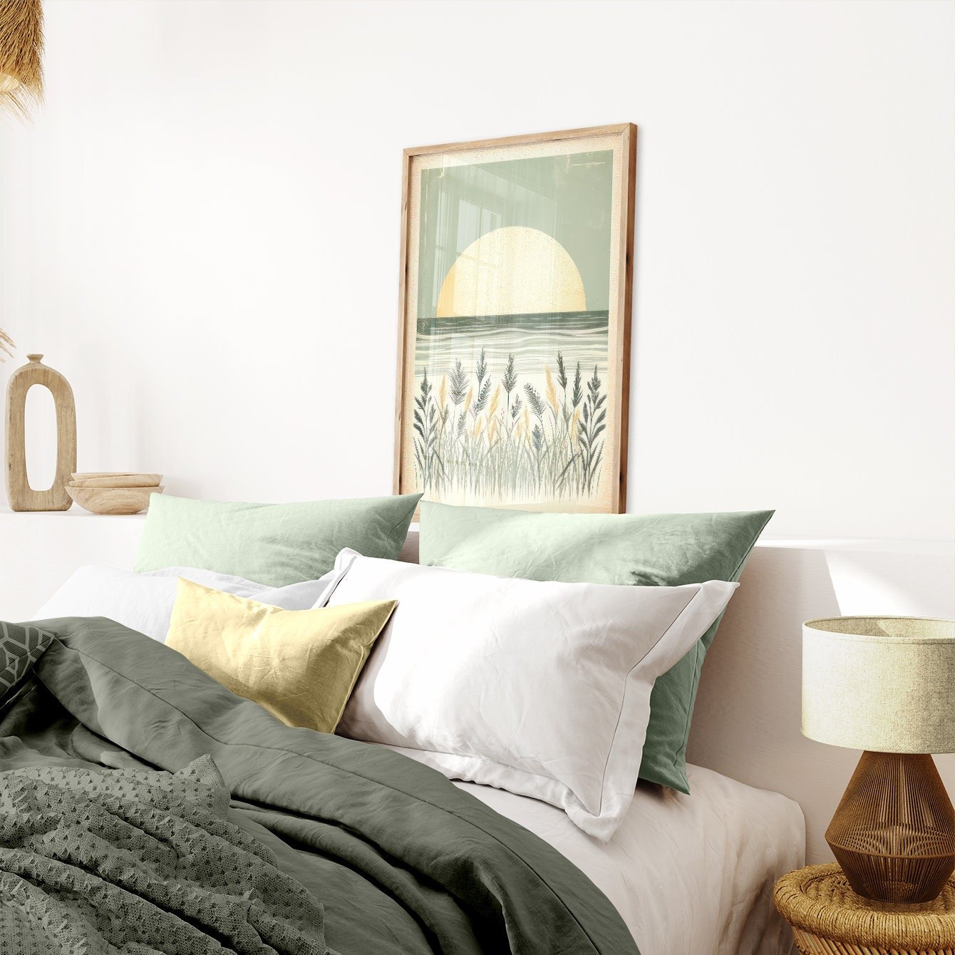 This print captures a stunning big yellow sunset cradled by teal green waves, framed by gentle beachside flora. The distressed light beige border adds rustic charm, enhancing its serene vibes.