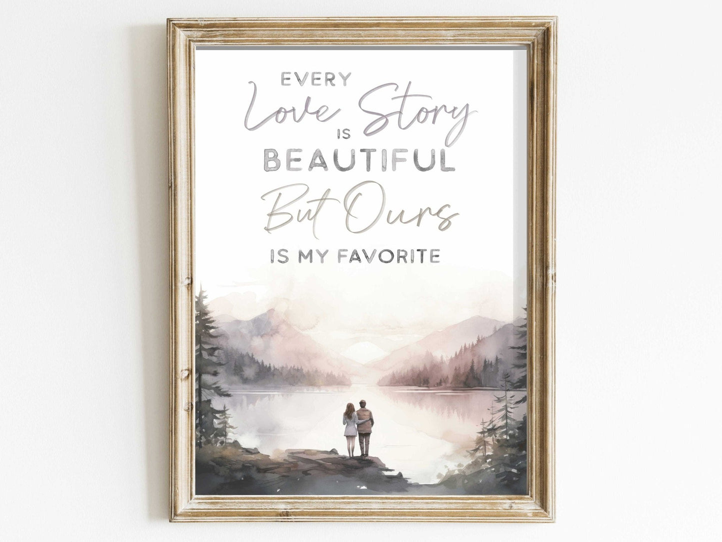 Ignite the warmth of your love story with our enchanting "Every Love Story is Beautiful, but Ours is My Favorite" digital printable wall art. This design showcases a couple embracing during a breathtaking sunset, symbolizing the profound bond you share. It's not just art; it's a heartfelt reflection of your unique romance.Vibrant Colors for Your Couples Room Decor