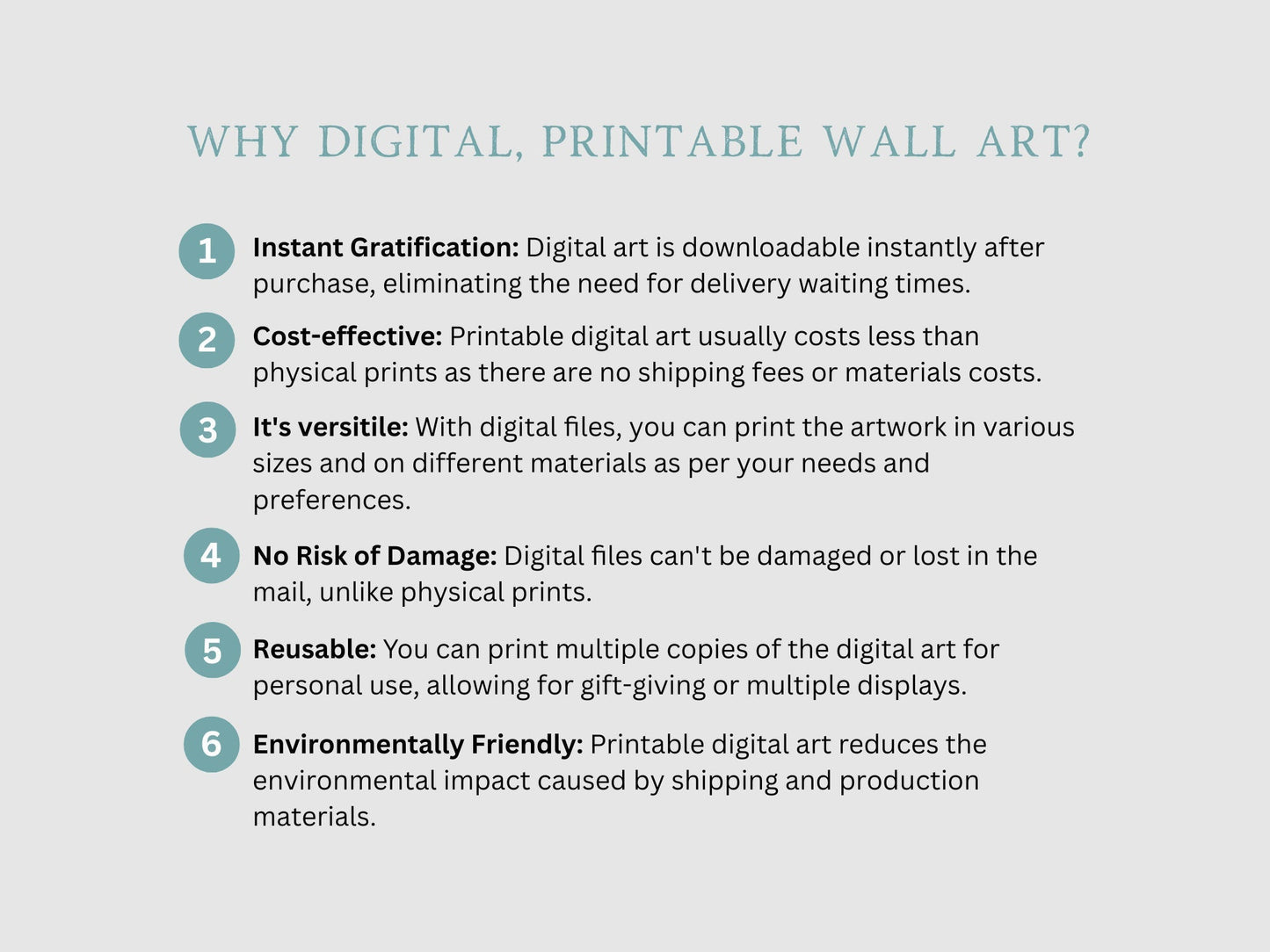 Are you a DIYer or prefer it printed and shipped? Opt for a digital download with 5 high-res files to print in up to 25 sizes, offering savings and flexibility. Or choose a physical print, professionally printed on high-quality fine art paper in multiple sizes. This printable wall art ensures your space is uniquely yours.