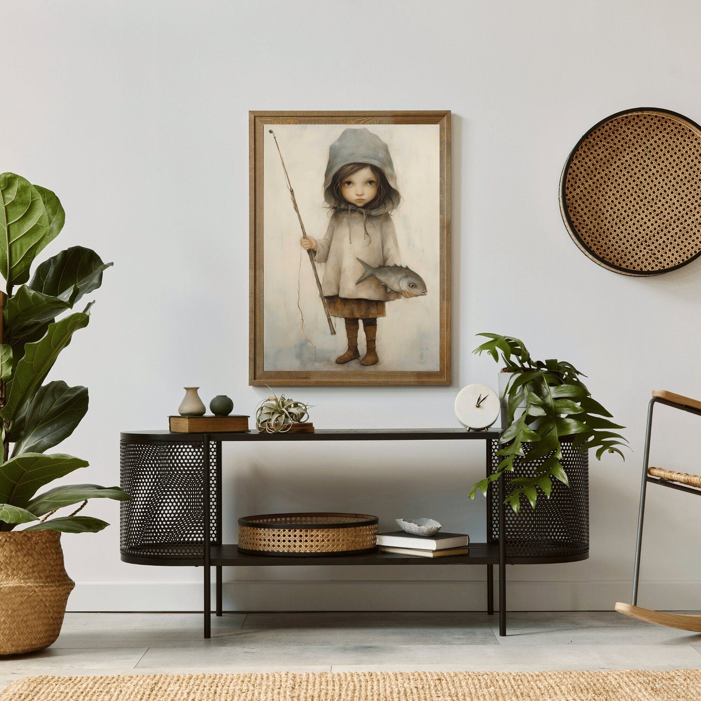Step into a world of wonder with this charming print of a little girl holding a fish and fishing rod. Perfect for sparking imagination and storytelling in your child's room.