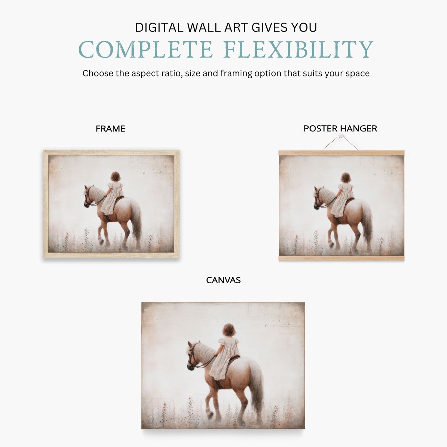 Delight in the innocence and wonder of a young girl riding her horse across a sunlit field. This enchanting print invites endless dreams and adventures, perfect for sparking imagination.