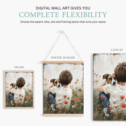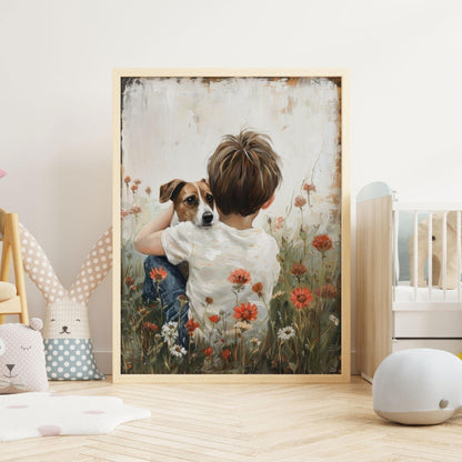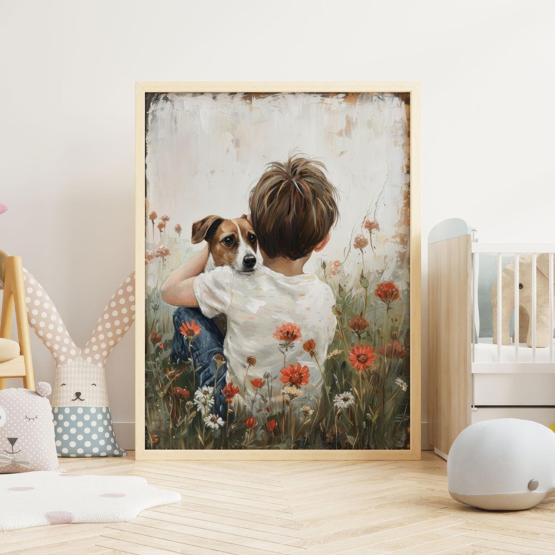 Transform your child's room with this touching artwork. Click 'Add to Cart' to bring the magic of boyhood and furry friendship into your home today!