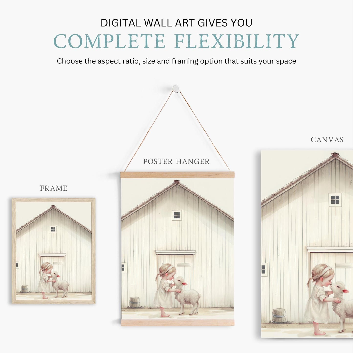 Transform your child's space with our enchanting Girl and Lamb Print Set of 3. This vintage-inspired triptych captures the pure bond between a toddler girl and her gentle lamb, set against a serene white barn. The soft colors and intricate details evoke peace and innocence, making it a delightful addition to any nursery or child's room.