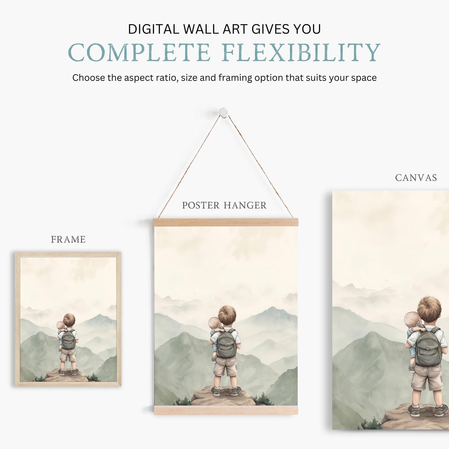 Celebrate the special connection between siblings with this enchanting artwork featuring a big brother carrying his baby brother, set against a stunning green mountain backdrop. This vintage-inspired piece radiates love, protection, and adventure, making it the perfect addition to your child's nursery or boys' room decor.