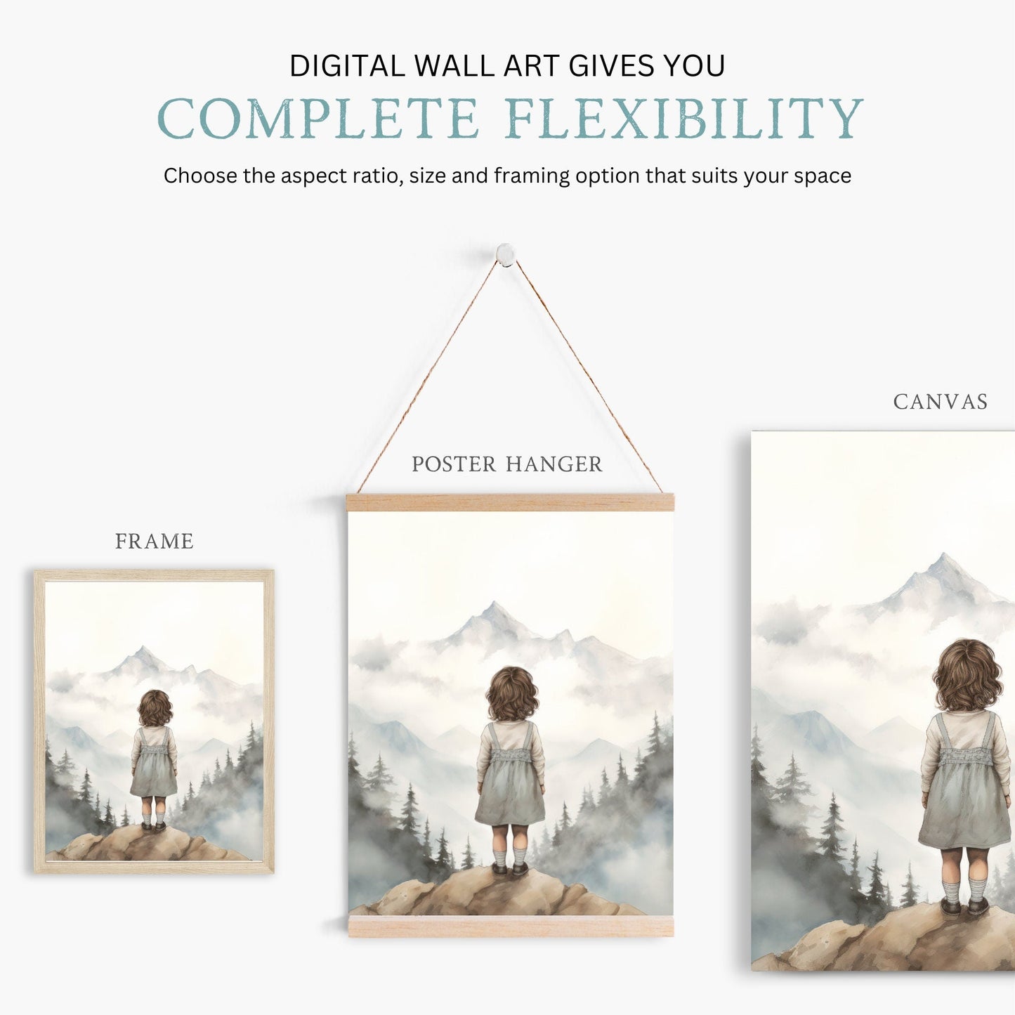 Capture the wonder of exploration with this charming print of a little girl gazing at majestic mountains. Perfect for inspiring a love of nature and adventure in your child's room.