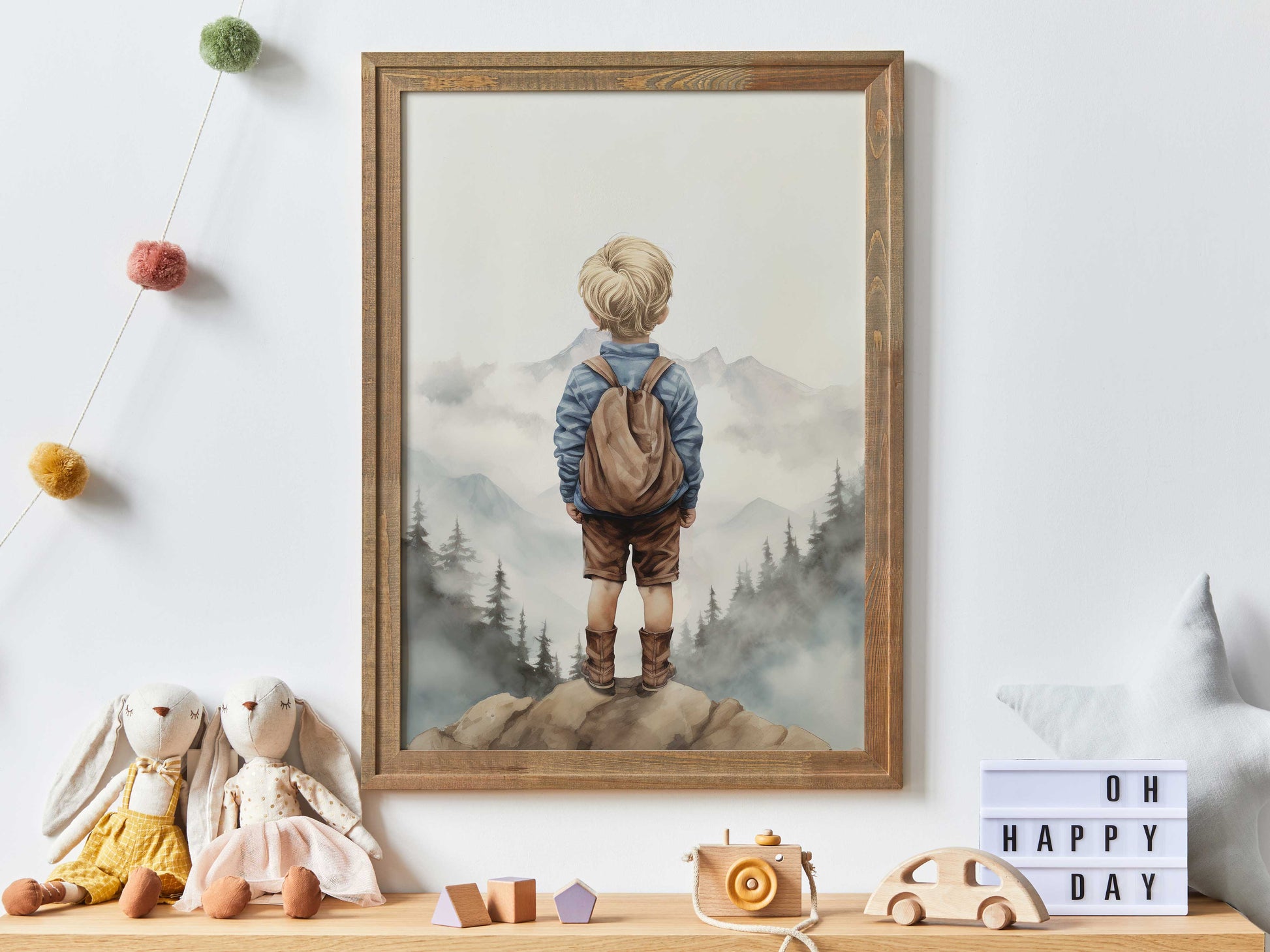 This print features a young explorer on a mountain, symbolizing courage and ambition. It's an ideal piece for inspiring young minds and adding a touch of adventure to any room.