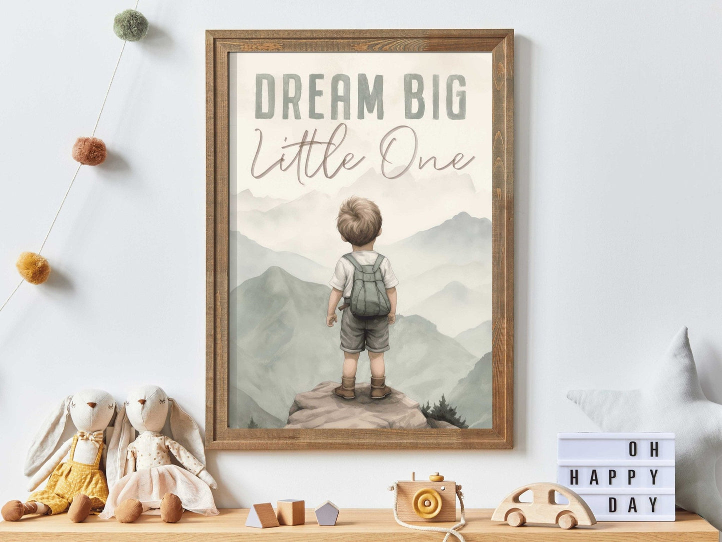 Transport your child to a world of exploration with this captivating watercolor print. Featuring a little boy on a mountain ledge, it inspires wonder and adventure. Perfect for sparking imagination in your boy's room.