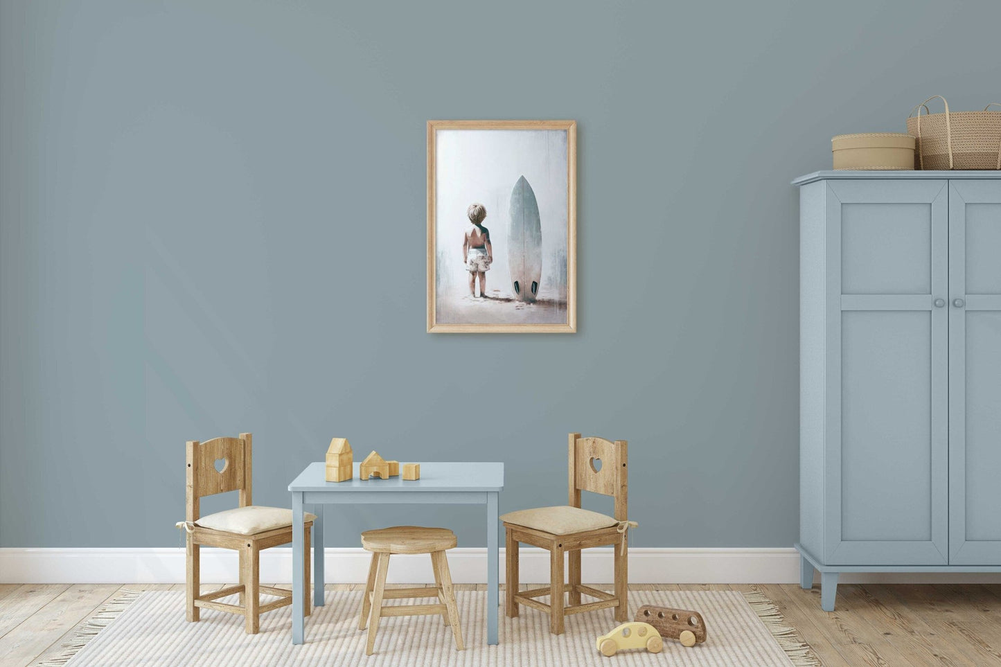 This minimalist piece features a young surfer boy beside his surfboard, evoking a sense of freedom and exploration. It's a delightful addition to any boy's room, sparking imagination and a love for the ocean.