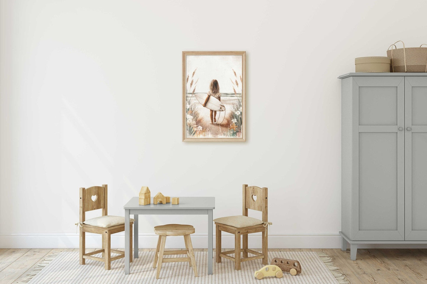 Capture the essence of adventure with this charming print of a young surfer girl in a floral dress, surfboard in hand, walking towards the azure waves through a blooming beachscape.