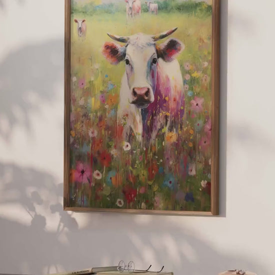 Capture the essence of rural charm with this stunning depiction of a white bull cow surrounded by vibrant wildflowers. Perfect for those who cherish countryside beauty and vintage art style.