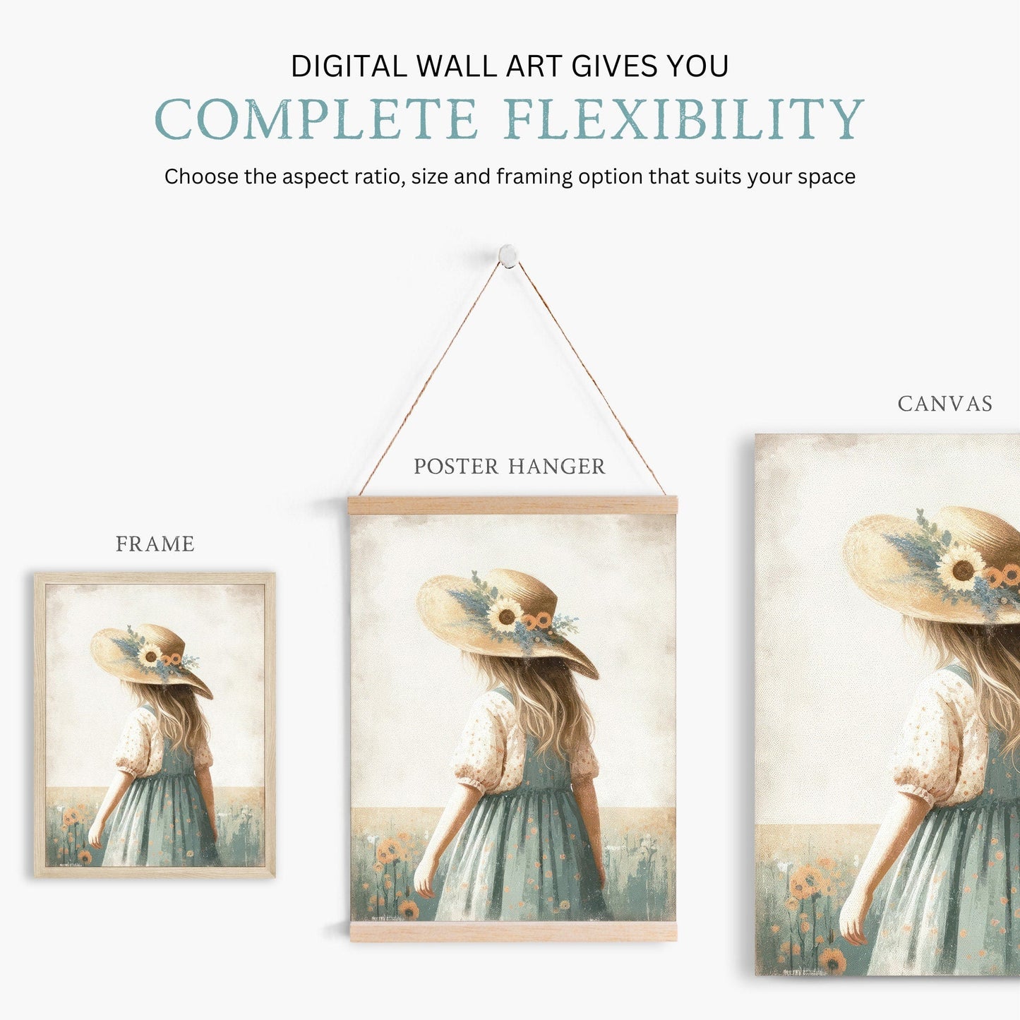 This enchanting print captures a young girl in a teal dress and yellow straw hat, lost in a field of wildflowers. Set against a light beige background, it evokes innocence and wonder.