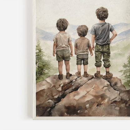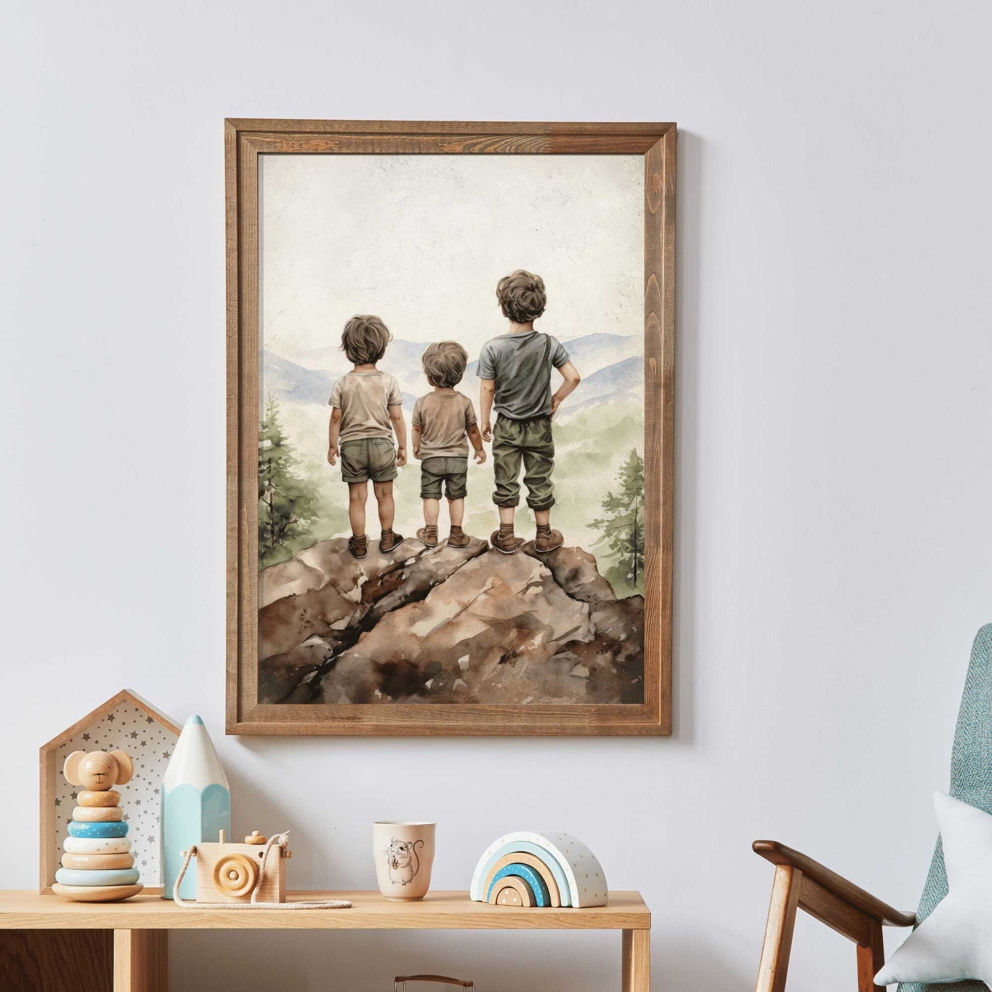 🌄 Rediscover the magic of childhood dreams. This captivating print captures three young adventurers on a mountain peak, inviting you into a world of wonder and imagination.